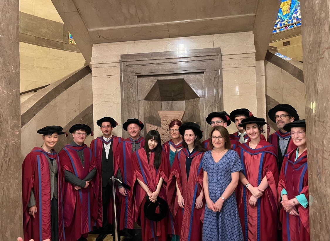 於英國皇家音樂學院(Royal Academy of Music)博士授袍典禮,與教授及同窗合影。(註:該校建於 1822